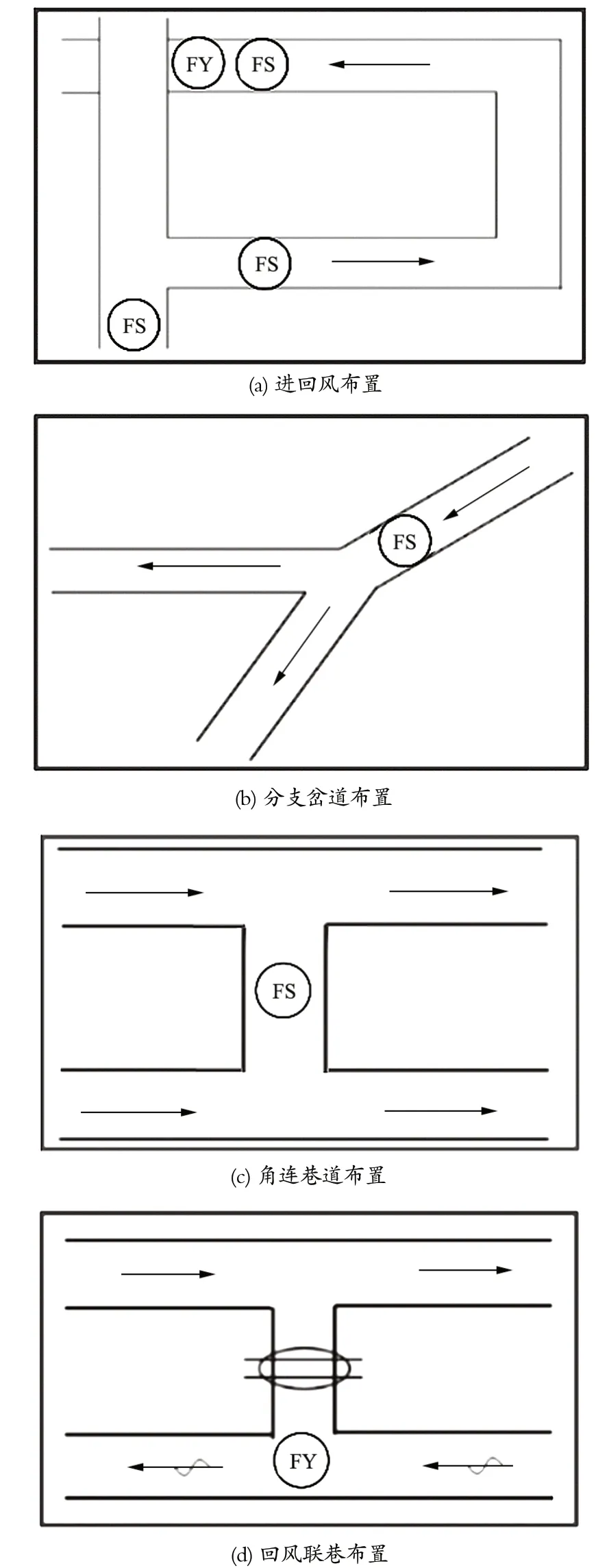 針對井下各地點作業(yè)內(nèi)容與通風不同方式,尤其是在繞道車場、分支岔路巷道和聯(lián)絡巷等地點,需要安裝傳感器進行監(jiān)測。此外,在 Y 形和 U 形通風方式的采煤工作面回風流側也容易出現(xiàn)風流不穩(wěn)定現(xiàn)象;在主要運輸大巷、掘進工作面設置有調(diào)節(jié)風窗的風門前后,由于運輸需要經(jīng)常開啟風門,容易導致風流擾動影響較大,產(chǎn)生局部風速、風壓變化。這些地點均需要安裝傳感器加強監(jiān)測。